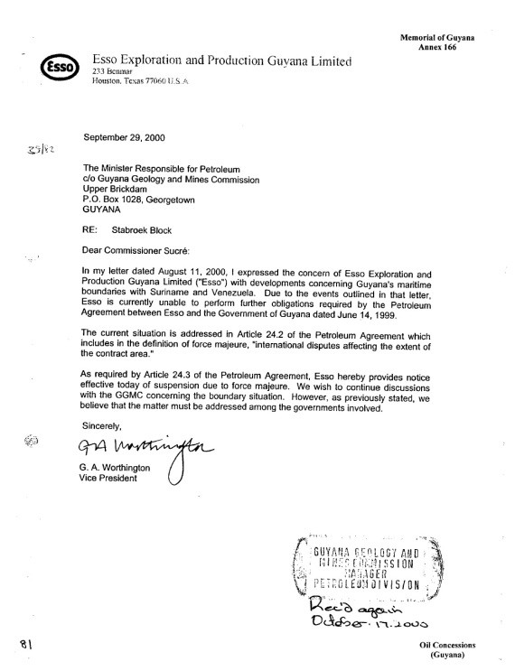 Nota enviada por Esso Guyana (filial de Exxon Mobil) al Ministerio de Petróleo de Guyana y a la Comisión de Geología y Minas, firmada por G.A. Worthington, vicepresidente de la empresa, informando que se retiraba “temporalmente” del área, reconociendo que “existía una disputa territorial” en la misma.